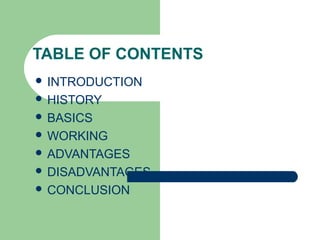 This document discusses WiTricity, a technology that enables wireless power transfer over mid-range distances without wires or cables. It provides a brief history of wireless power, outlines the three main types of wireless power transfer, and describes how resonant induction works to increase range. The key benefits of WiTricity are that it provides efficient energy transfer over distance while being safe for people and can penetrate obstacles. Applications include powering consumer electronics, transportation, medical devices, and beaming power to drones or satellites.