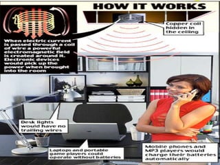 This document discusses wireless electricity or Witricity, which involves transmitting power from one device to another without wires. It summarizes the history of the concept from Nikola Tesla's experiments over 100 years ago. Witricity works using resonant inductive coupling between coils, with one coil transmitting power through an electromagnetic field to a receiving coil. Potential applications include wirelessly charging consumer electronics, electric vehicles, and industrial/medical devices. While the technology faces challenges like efficiency over distance and standardization, it could eliminate wired infrastructure and have significant economic and environmental benefits.