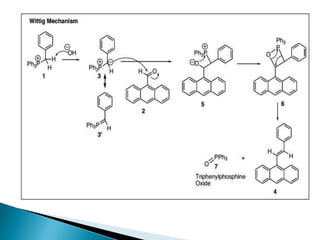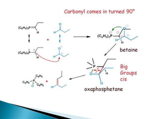 The Wittig reaction involves reacting an aldehyde or ketone with a triphenylphosphonium ylide to form an alkene and triphenylphosphine oxide. The reaction proceeds through betaine and oxaphosphetane intermediates. The stereochemistry of the product can be controlled by the reactants and conditions. Similar reactions are the Horner and Horner-Emmons-Wadsworth reactions, which use different reagents. The Wittig reaction is one of the main methods for synthesizing alkenes from carbonyl compounds.