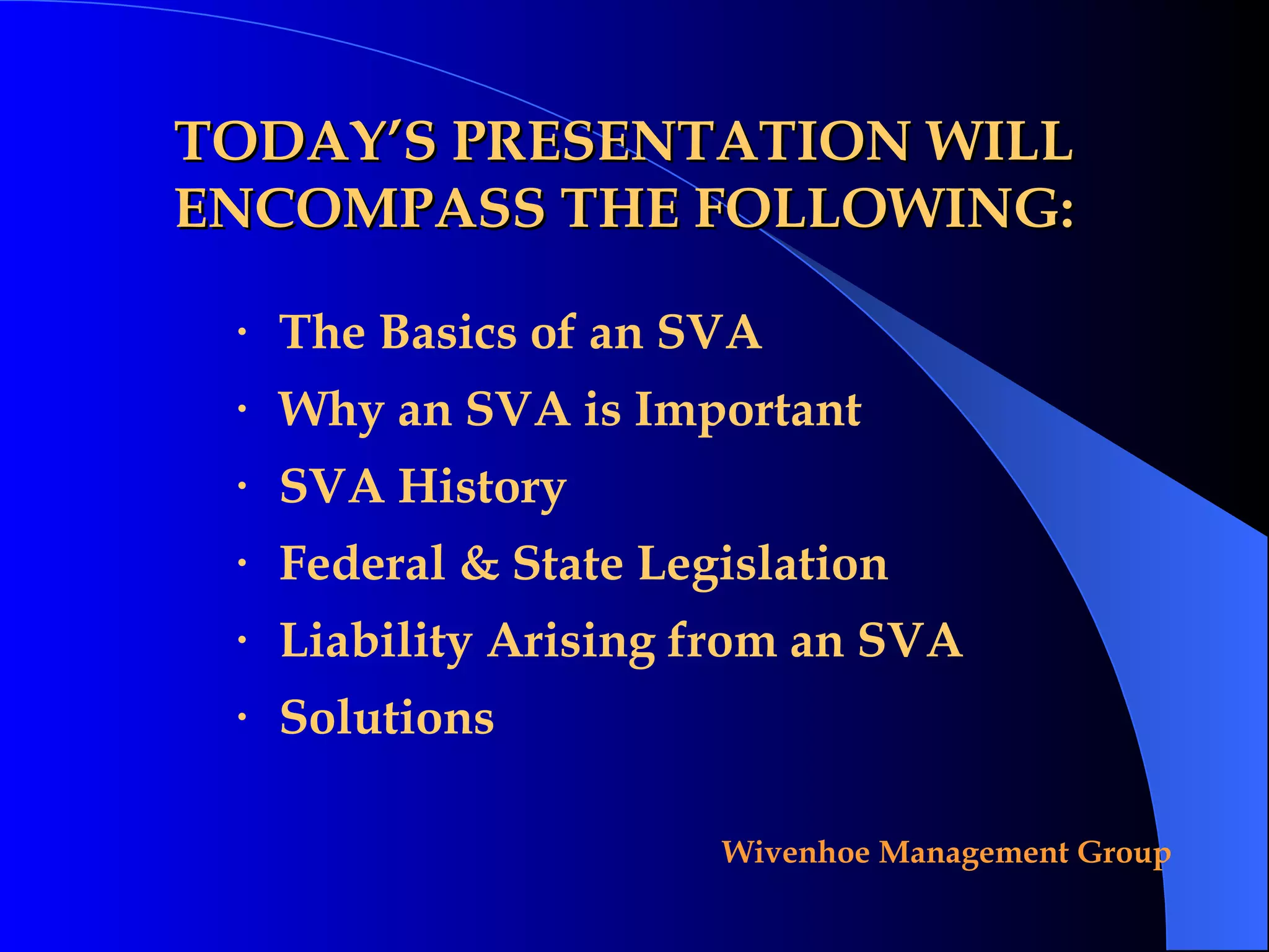 The document discusses security vulnerability assessments (SVAs) and related liability issues. It provides background on SVAs, including their importance in identifying threats, assets, recommendations, and costs. It outlines the history of SVA legislation for various critical infrastructures. Performing an SVA helps reduce liability, as vulnerabilities identified must be addressed. Failing to do so after an incident related to a known vulnerability could result in negligence claims and punitive damages. New state legislation is expanding SVA requirements.