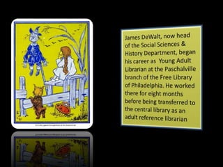 James DeWalt has been the head librarian of the Social Sciences & History Department since 1995. He holds masters degrees in library science and history. As the department head, he is responsible for selecting materials for the collection, managing staff, and ensuring the library meets users' needs. The role requires balancing building specialized collections while also generalizing to serve the public. He advises new librarians to develop a diverse set of information technology skills to adapt to a changing field.