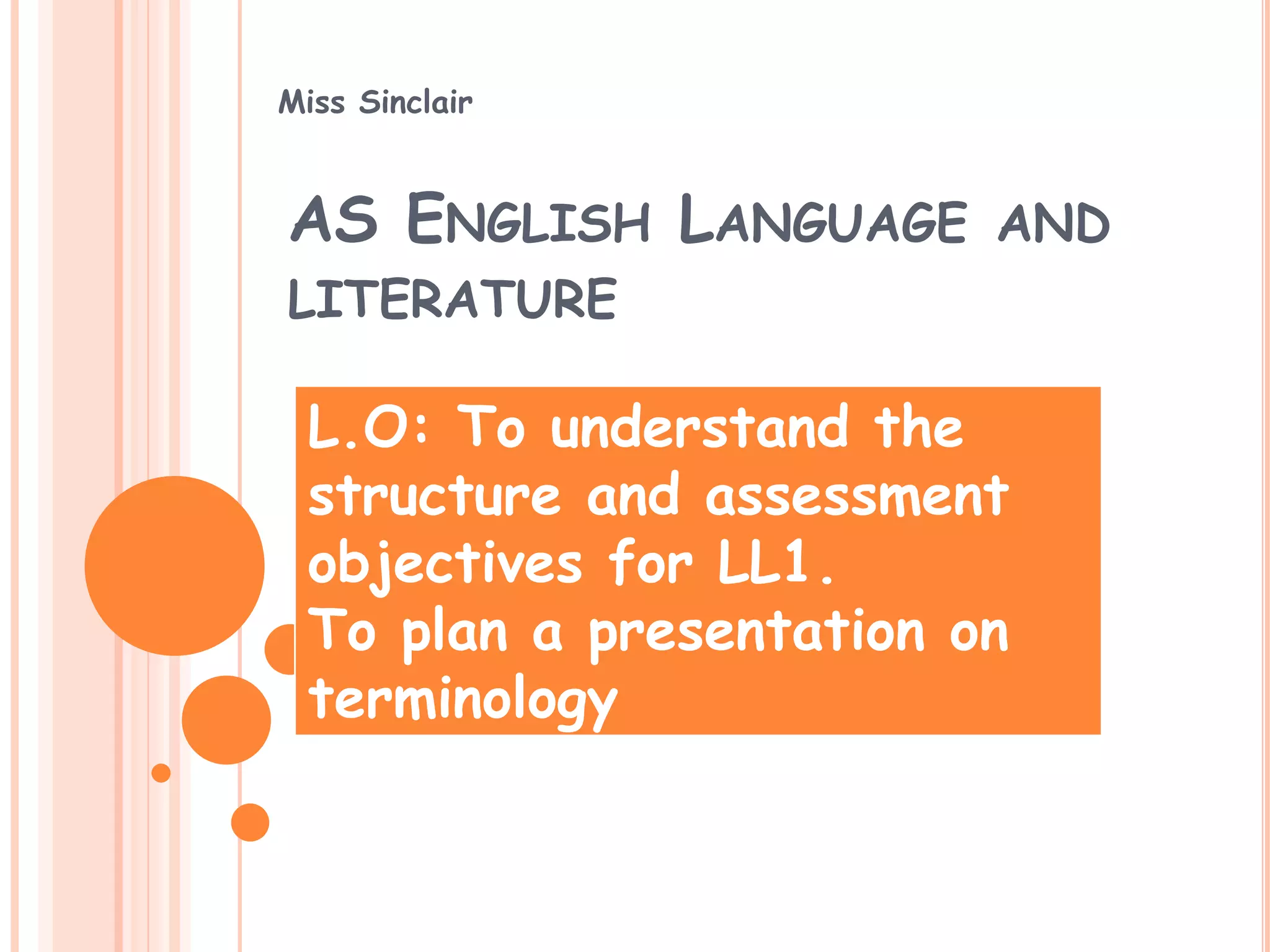 This document outlines the structure and assessment objectives for English Language and Literature (LL1). It provides an overview of what students will study during the year to prepare for the LL1 exam. The exam consists of two sections - Section A focuses on poetry pre-1900 and an unseen text, while Section B examines prose texts. Students will be assessed on their ability to analyze language, structure, and contextual factors (Assessment Objectives 1-3). To prepare, students will learn terminology and analyze example poems and texts. As homework, students will work in groups to create presentations teaching their peers different terminology related to literary and linguistic analysis.