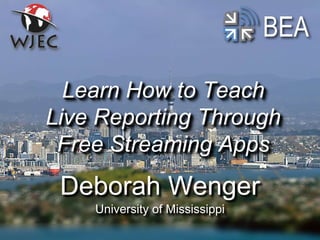 Deborah Wenger from the University of Mississippi discusses the use of free streaming apps for live reporting, highlighting the ease of platforms like Periscope and Facebook Live. She emphasizes the importance of preparation and interaction during live broadcasts while addressing legal considerations and best practices. The document also encourages educators to integrate live streaming into their teaching to better prepare students for real-world journalism opportunities.