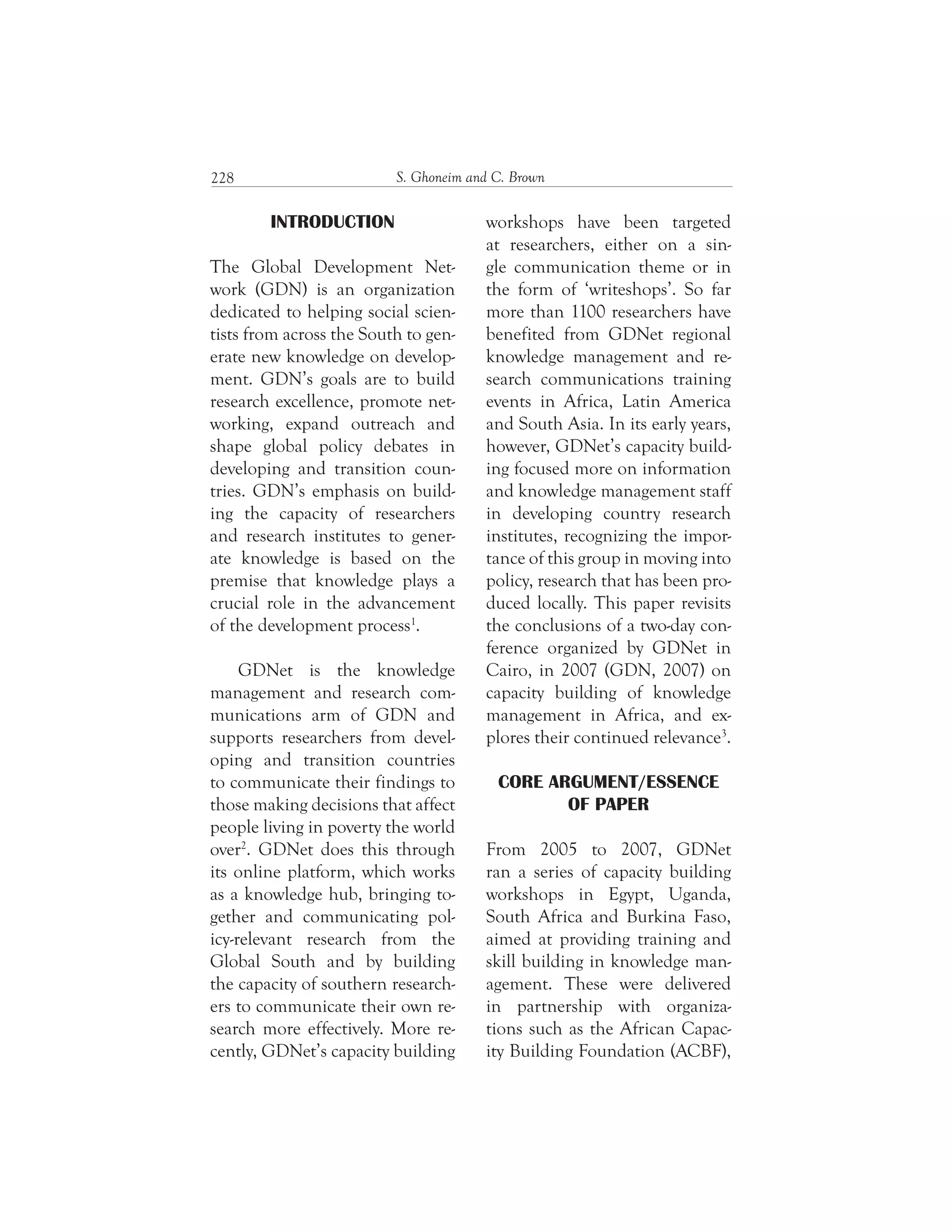 This document summarizes a paper that reflects on GDNet's experience building knowledge management capacity among research institutes in developing countries. It discusses a 2007 conference in Cairo that examined challenges like creating synergy between technological and social knowledge management approaches, prioritizing limited resources, promoting local knowledge creation and ownership, sharing knowledge sharing experiences, addressing inequities in access to knowledge, and facilitating partnerships. The document reviews how relevant these challenges remain today and describes how GDNet continues working to build capacity through activities like workshops, online platforms, and partnerships.