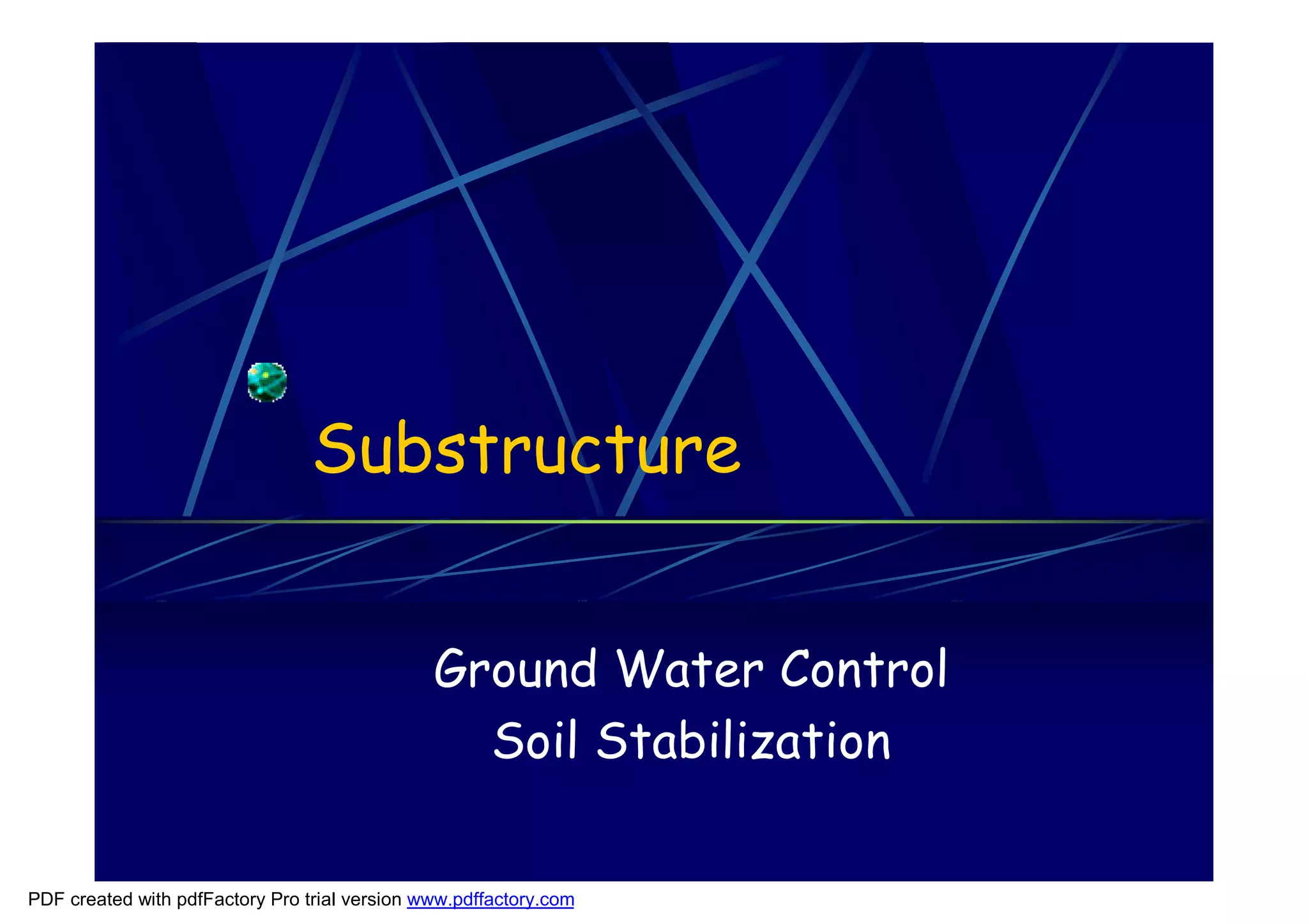 The document discusses various methods for controlling groundwater, which can be divided into permanent and temporary exclusion. Permanent exclusion methods like sheet piling, diaphragm walls, and grouting form barriers to block groundwater flow. Temporary methods like dewatering wells and deep boring lower the water table to allow for excavation work before groundwater levels return. The effectiveness of each method depends on the soil type and project needs.