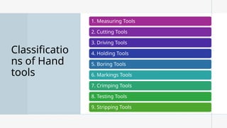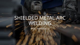 The document provides an overview of basic hand tools used in shielded metal arc welding, classified into categories such as measuring tools, cutting tools, driving tools, and more. Each category is described with examples, detailing their purposes and specific types, including push-pull rules, hacksaws, pliers, and multi-meters. The document emphasizes the importance of these tools for various welding and metalworking tasks.