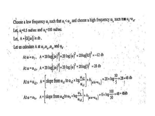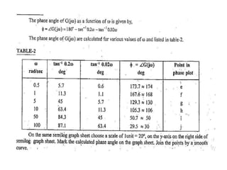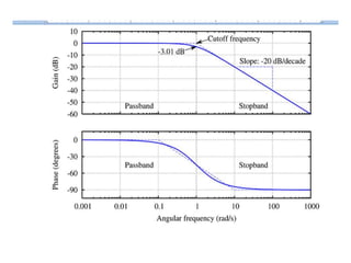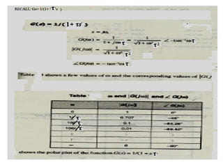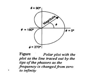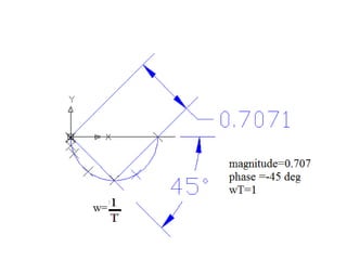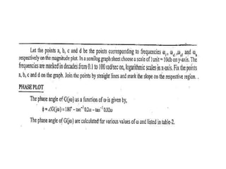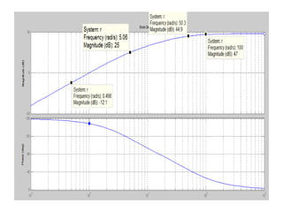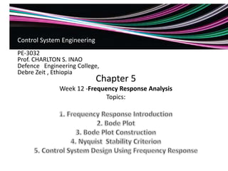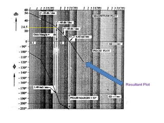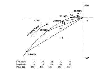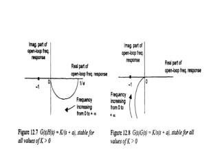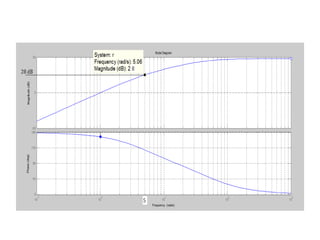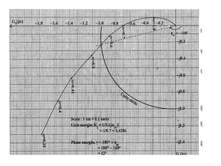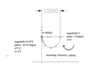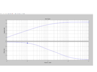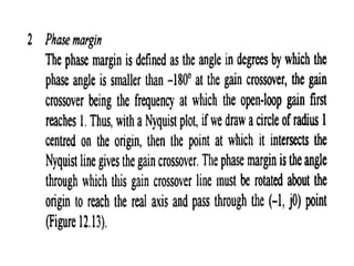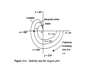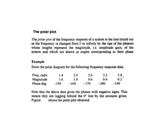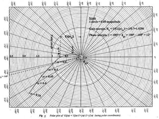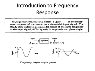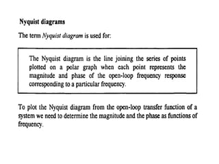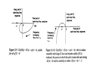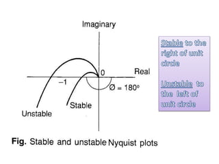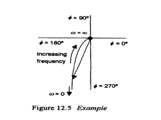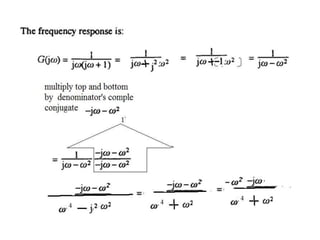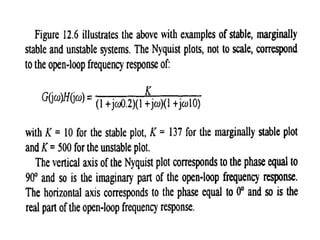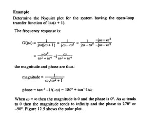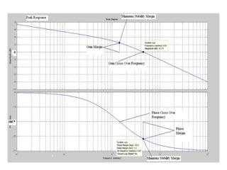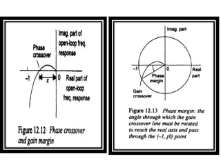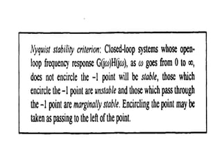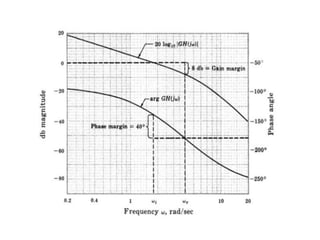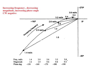 This document discusses frequency response analysis and Nyquist stability criterion. It begins with introductions to frequency, amplitude, phase, and Bode plots. A Bode plot shows the magnitude and phase of a system's frequency response on logarithmic scales. Key points include the gain and phase crossover frequencies. The document then covers Nyquist plots, which show the system's frequency response in the complex plane. The Nyquist stability criterion uses Nyquist plots to determine stability by examining where the plot intersects the real axis. Gain and phase margins are stability metrics calculated from the frequency response. MATLAB is demonstrated for constructing Bode and Nyquist plots. Homework involves populating tables of frequency response data and making plots.