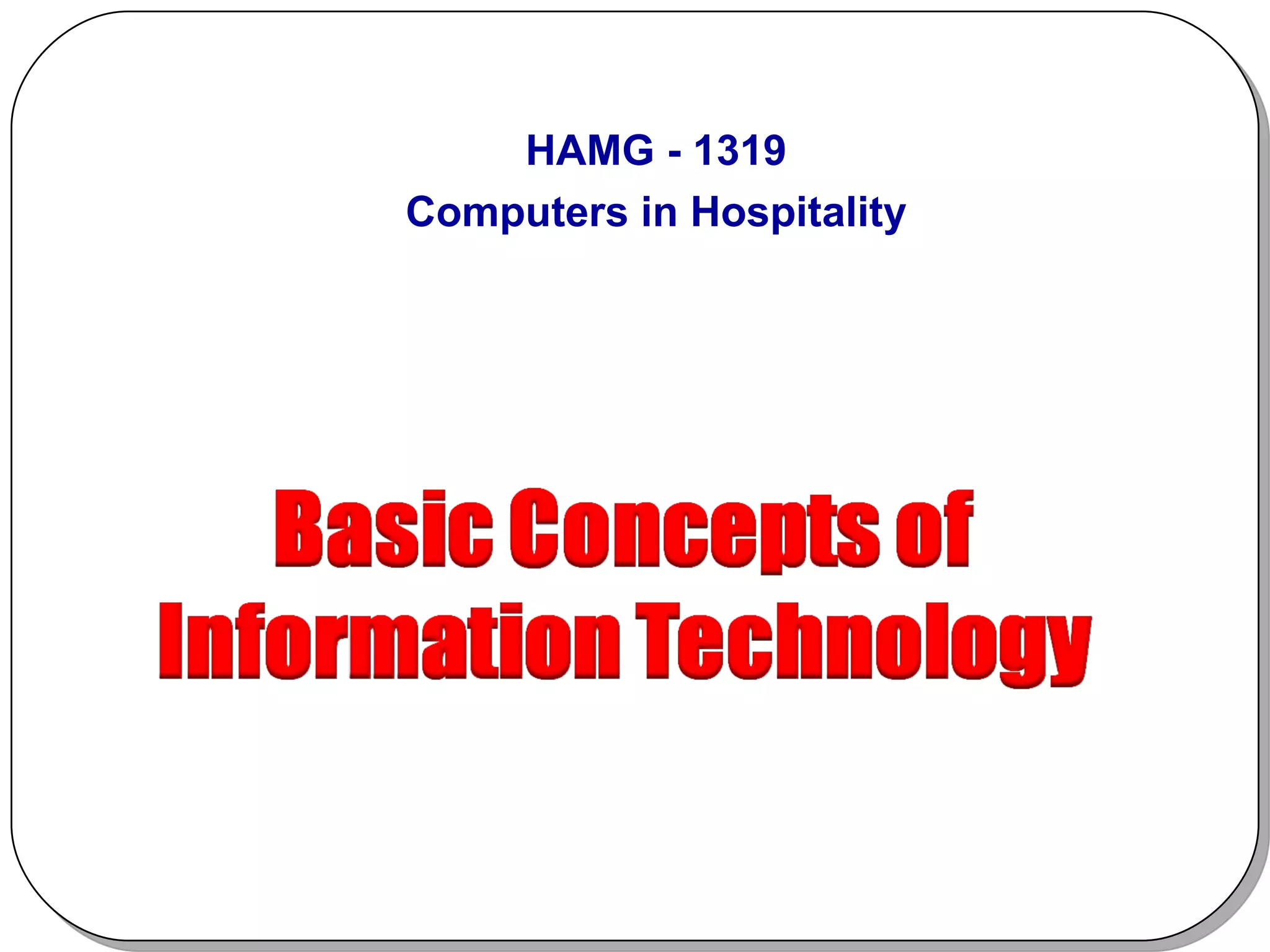 The document discusses hardware, software, and information technology concepts related to computers. It defines hardware as the physical components of a computer and software as the instructions that make the computer work. It then describes the main parts of a personal computer including the central processing unit (CPU), hard disk, random access memory (RAM), read only memory (ROM), and common input devices. The document also discusses operating systems, applications software, local and wide area networks, the internet, and common uses of computers at home, work, and education.