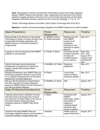 The document outlines a strategy for technology integration in education, focused on engaging students and sharing best practices among teachers, parents, and the community. It details various steps for the preparation, professional development, and evaluation of technology integration lessons, including timelines and responsible individuals. The goal is to enhance teaching methods and student response through the effective use of technology resources and collaboration among educators.