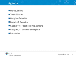 This document summarizes a presentation about Google+ and the +1 button. It introduces the Google+ team and charter, provides an overview of Google+ features like Circles and Hangouts, explains how the +1 button works in search and ads to show sentiment, and discusses implications for Google+ compared to Facebook and for businesses using Google+ and +1. It also considers questions around consumer adoption of Google+ and optimization for brands.