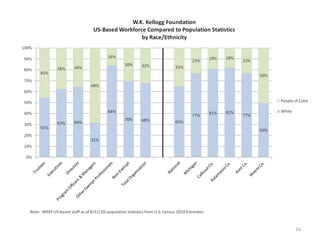 This document summarizes the workforce and board composition of the W.K. Kellogg Foundation by race, ethnicity, gender, and job category over time. It also compares the Foundation's workforce to select population statistics.