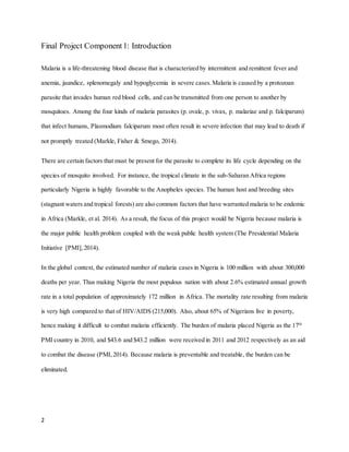 The project focused on malaria in Nigeria, where it is a major public health problem, with an estimated 100 million cases and 300,000 deaths per year. Malaria disproportionately affects children under 5 and the poor, and factors like poverty, lack of education, and cultural beliefs contribute to the high burden. Nigeria has implemented strategies like insecticide-treated bed nets and indoor residual spraying, as well as policies to improve prevention, treatment, and the public health system's response to malaria.