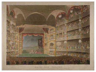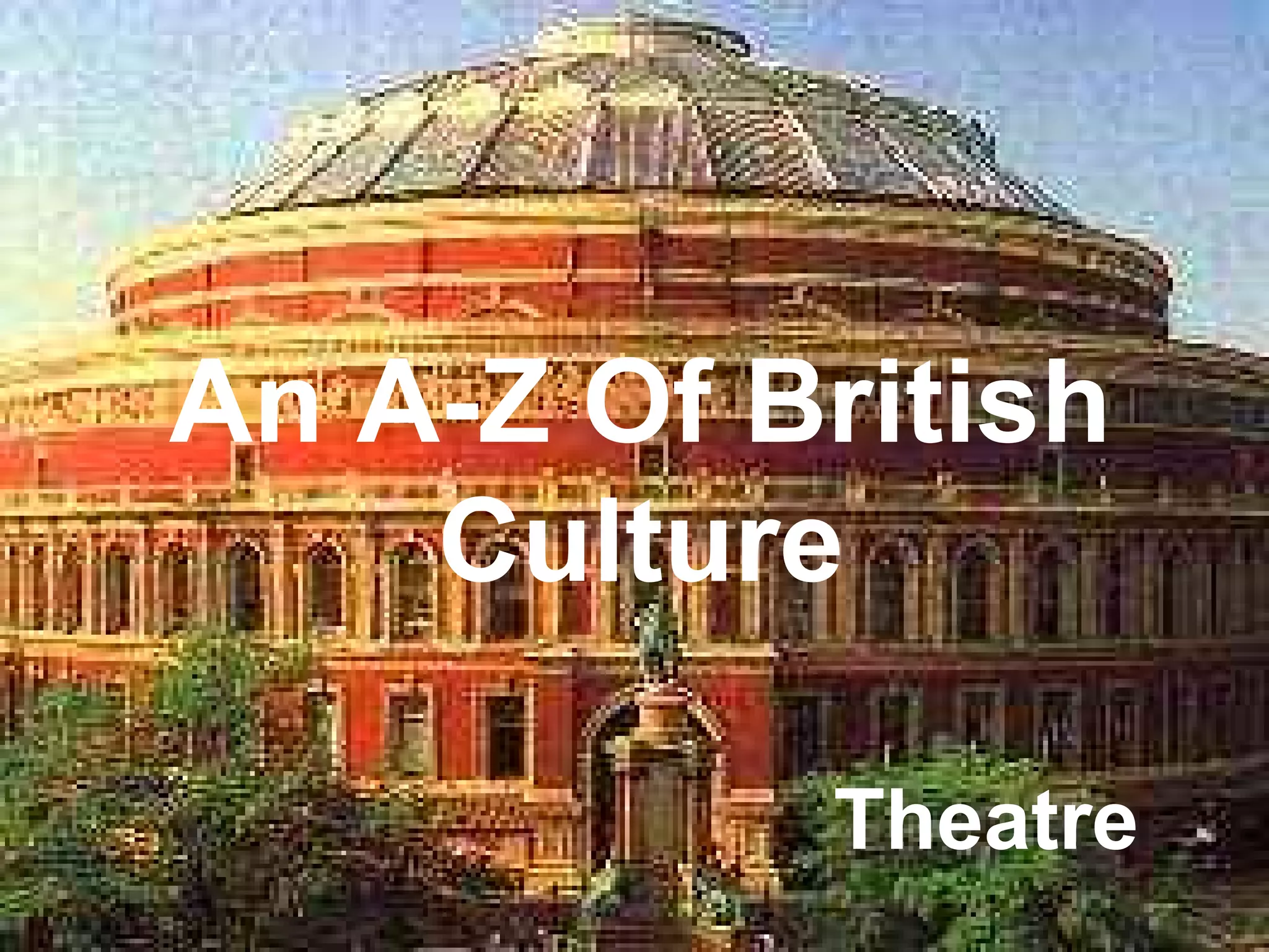 The document provides an overview of developments in British theatre from the 1940s to present day. It discusses the rise of social realism in the 1940s-1950s influenced by Samuel Beckett and Bertolt Brecht. The 1960s-1970s saw "shock tactics" and the growth of alternative theatre. The 1980s-1990s explored the impact of Margaret Thatcher's government. Significant playwrights mentioned include Harold Pinter, Caryl Churchill, Tom Stoppard, Alan Bennett, and Willy Russell. The summary also highlights theatre in Scotland, for women, and from ethnic minority groups.