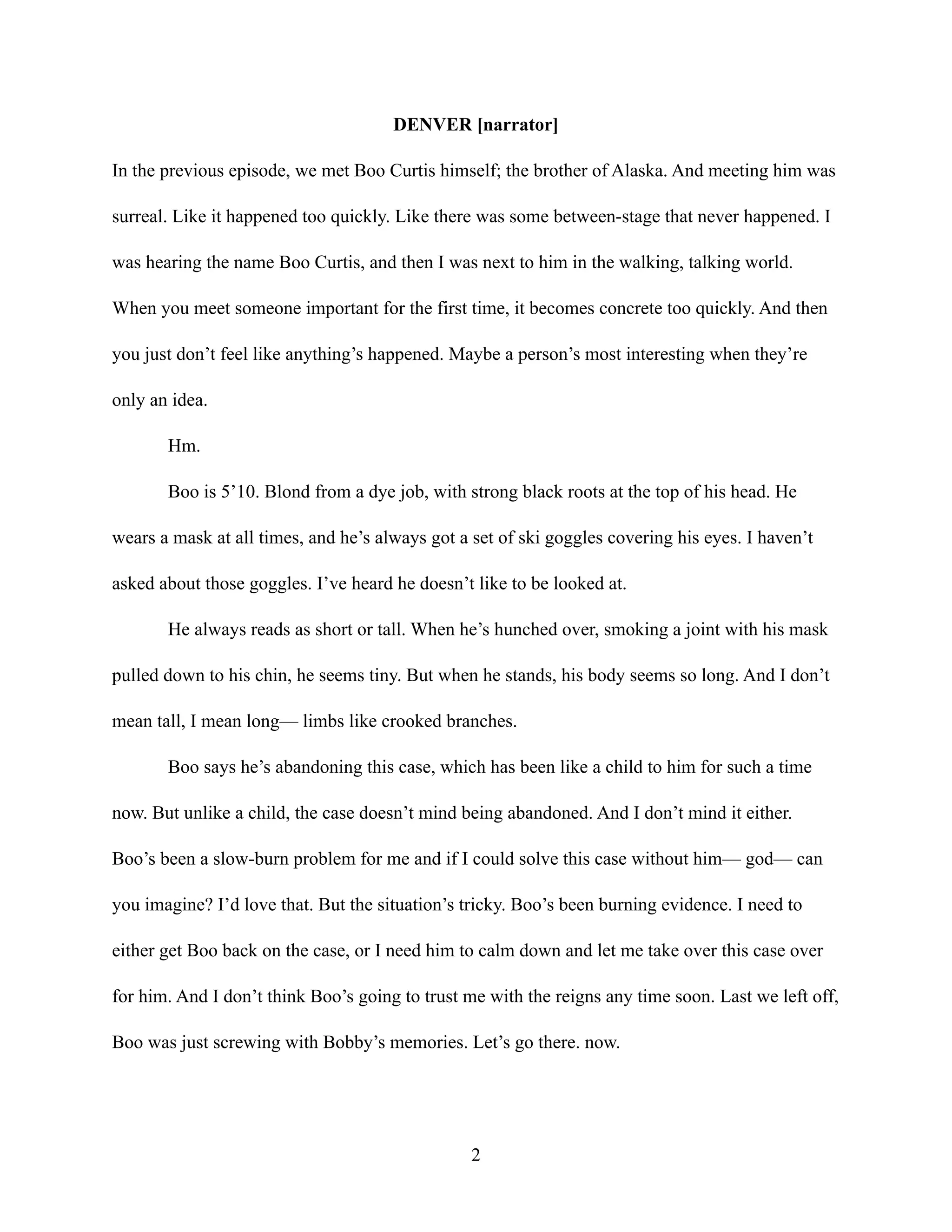 In 'Who Killed Alaska: Detective Files, Episode 10,' detective Finn Denver grapples with Boo Curtis's abandonment of an ongoing murder case while dealing with the implications of Boo's manipulation of another character, Bobby's, memories. The narrative includes a mix of surreal interactions among the characters, including hypnotic attempts to address these false memories, set against a backdrop of a blizzard. The tension escalates as Denver, Jo, and Boo confront the consequences of their actions in search of the truth behind Alaska's murder.