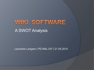This document presents a SWOT analysis of wikis. It identifies strengths such as openness, facilitating collaboration, and creating knowledge communities, while weaknesses include difficulties trusting content and content constantly changing. Opportunities are motivating collaboration and being a versatile learning tool. Threats include users erasing content and copyright issues. The conclusions state that wikis can help facilitate learning if used to deliver learning experiences, and that addressing weaknesses can improve wikis.