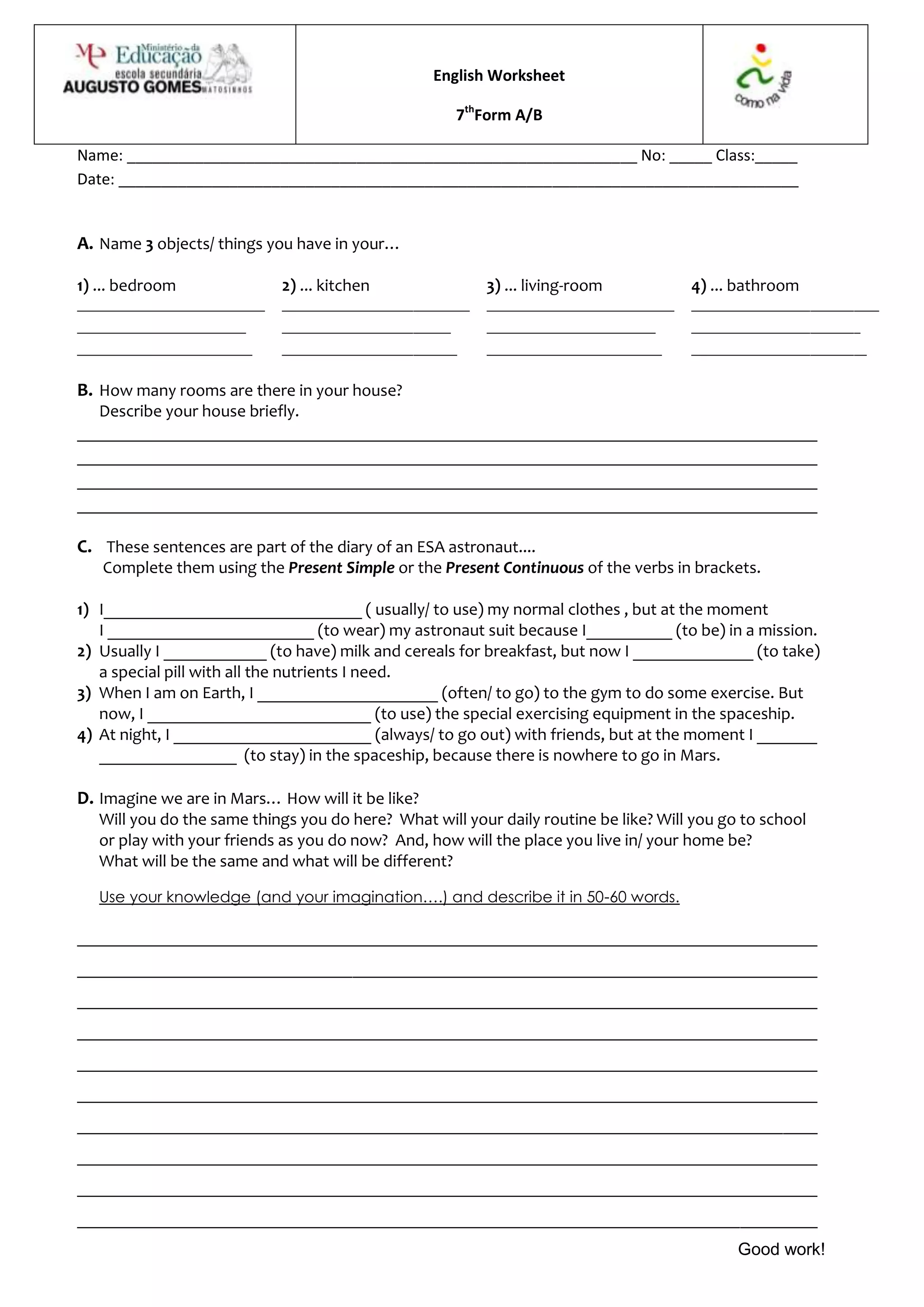 This document is an English worksheet that contains questions asking students to describe objects in their home, the number of rooms in their house, complete sentences about an astronaut's daily routine in space, and imagine what daily life would be like on Mars. Students are asked to describe their imagined daily routine on Mars in 50-60 words.