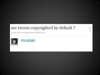 This document provides an introduction to social media law and copyright law. It discusses key concepts such as copyright, what works are covered by copyright, exclusive rights granted to copyright holders, infringement, statutory damages, fair use, safe harbors, and privacy issues. It also briefly touches on issues such as licensing Creative Commons content, anti-SLAPP laws, the Streisand effect, and credits/attributions.