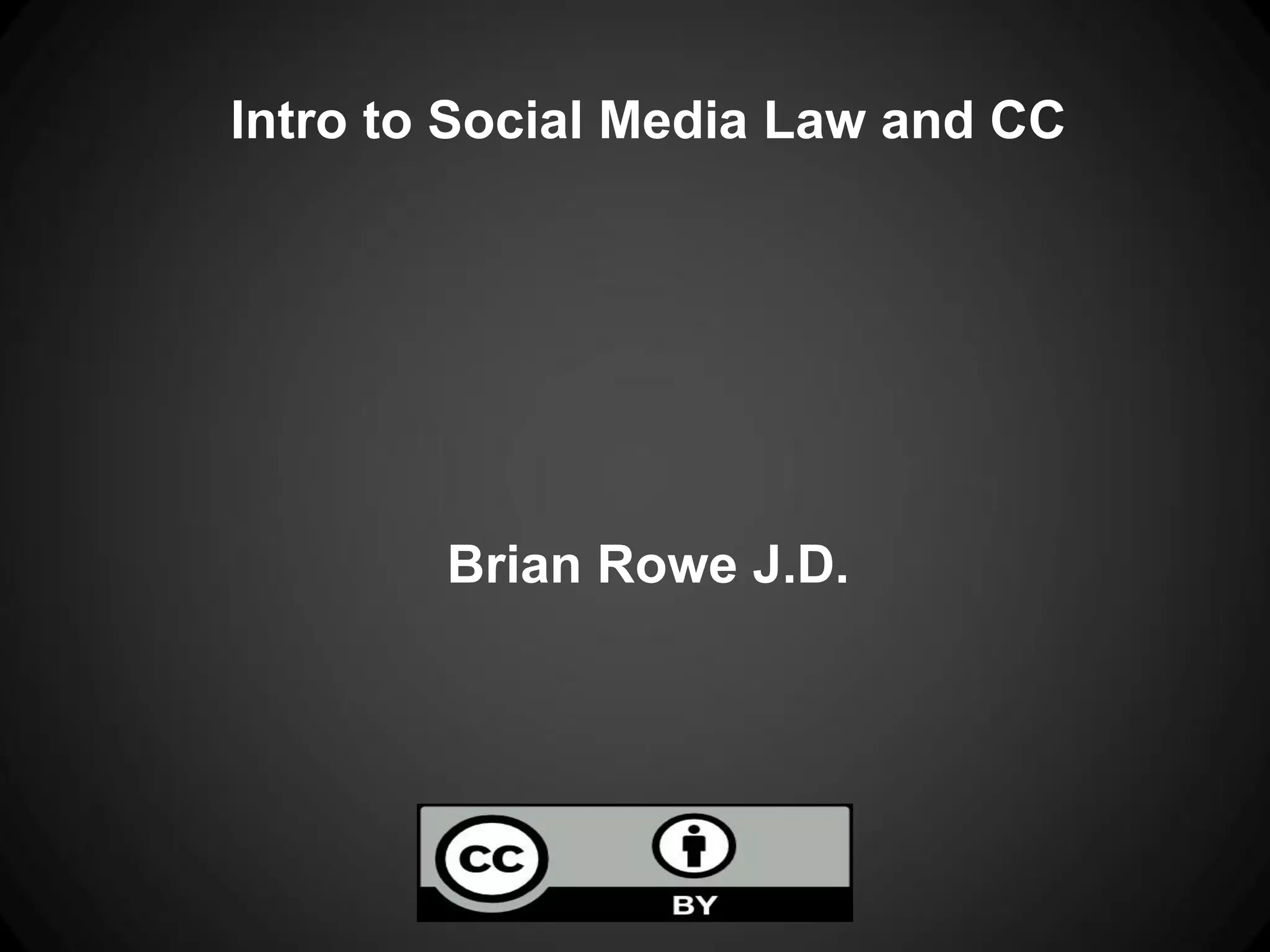 This document provides an introduction to social media law and copyright law. It discusses key concepts such as copyright, what works are covered by copyright, exclusive rights granted to copyright holders, infringement, statutory damages, fair use, safe harbors, and privacy issues. It also briefly touches on issues such as licensing Creative Commons content, anti-SLAPP laws, the Streisand effect, and credits/attributions.