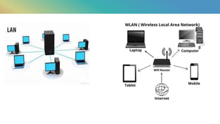 A wireless local area network (WLAN) is a network of devices that uses radio transmissions for communication, enabling connectivity without physical wiring. WLANs, commonly known as Wi-Fi, serve various applications such as internet access, emergency setups, and networking in historic buildings. The architecture of WLANs can be based on infrastructure (like home networks) or ad hoc setups (direct device-to-device connections), with key components including access points and network interface cards.