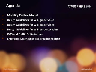 The document outlines guidelines for designing WLAN systems to effectively support voice, video, and location services within mobile enterprise environments. Key topics include RF design principles, authentication methods, QoS practices, and troubleshooting techniques essential for optimizing wireless network performance. It emphasizes the need for robust coverage, efficient client management, and adherence to best practices to ensure reliable service delivery.
