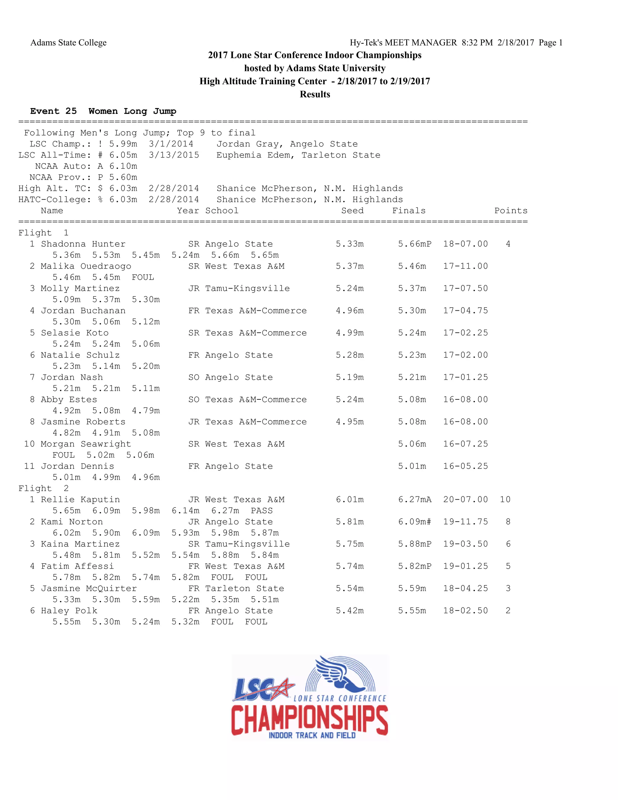 The document summarizes the results of the women's long jump event at the 2017 Lone Star Conference Indoor Championships. Rellie Kaputin of West Texas A&M won the event with a jump of 6.27 meters. Kami Norton of Angelo State finished second with a jump of 6.09 meters. Angelo State won the team competition with 73 points, followed by Texas A&M-Commerce in second place.