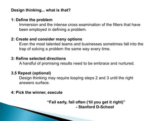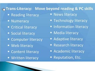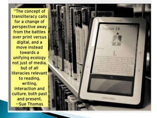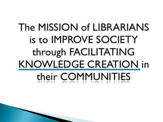 Kathleen Johnson presented on innovations in school librarianship at the WLMA Librarians conference. She discussed 7 areas of innovation: physical and virtual library spaces, the librarian's role as a learning specialist, transliteracy skills, embedded librarianship models, expanded professional development opportunities, personal learning environments centered on students, and redesigning library spaces through design thinking. The presentation was dedicated to advocating for school libraries.