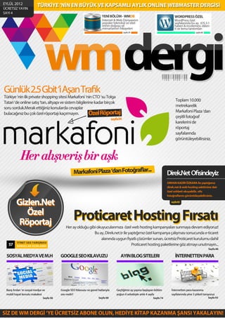 Değerli WM Dergi okuyucuları, Ağustos ayında yayınladığımız 3. sayımız itibari ile 100.000 tekil sayfa okunma tirajını aştık.Gösterdiğiniz bu yoğun ilgi ve destek için çok teşekkür ederiz. WM Dergi 4. sayısı ile birlikte sayfa sayısı da 100 oldu. Bu ay oldukça çeşitli ve zengin bir içerik hazırladık.Bunların en önemlilerinden birisi Markafoni röportajı.Bunun dışında bu ay WM Dergi ‘de toplam 3 adet röportaj yer almakta. Online Ticaret sektöründen; Markafoni, Web alanından; Gizlen.net, Web Hosting sektöründen ise Direk.net.tr ile yaptığımız röportajları okuyabilirsiniz.