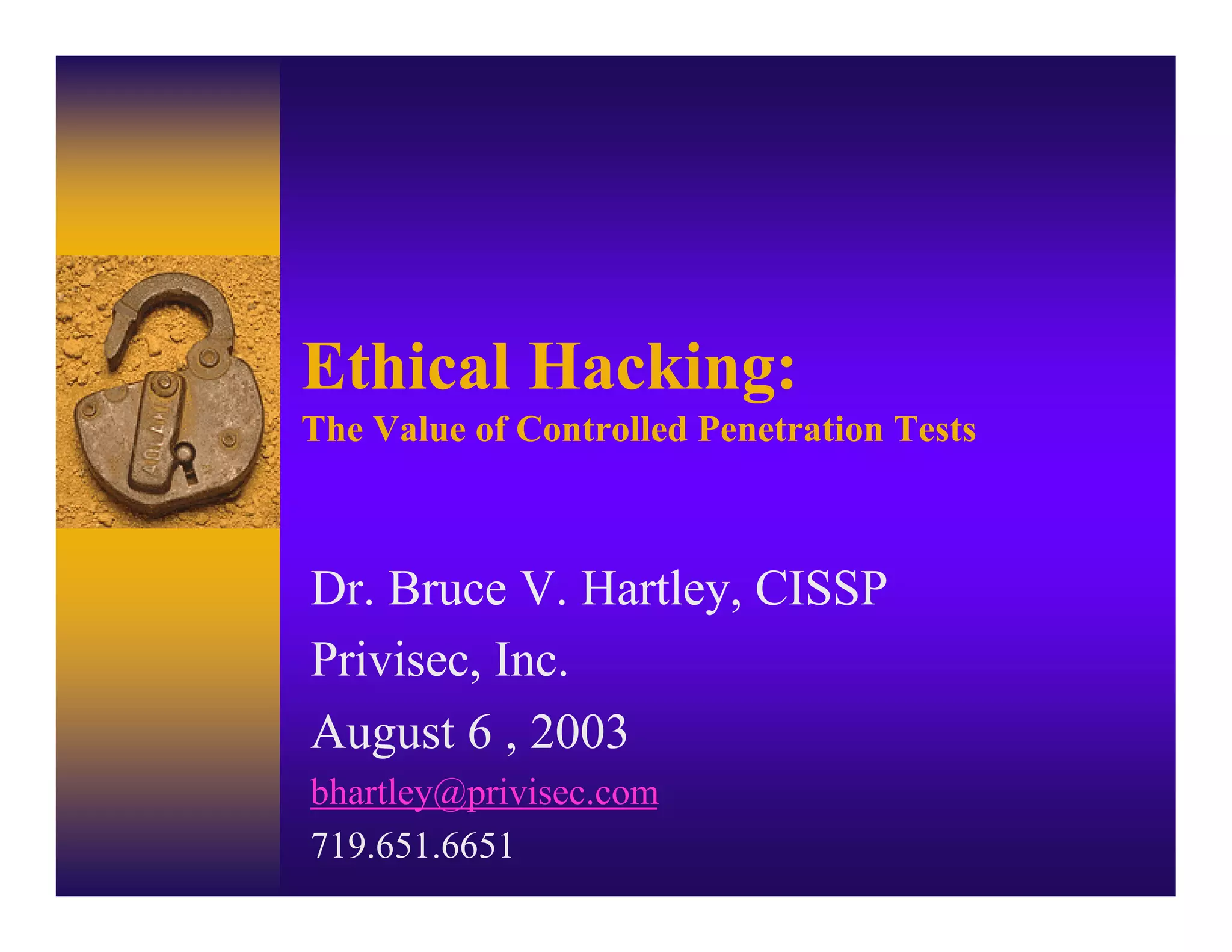 The document discusses ethical hacking and penetration testing. It provides an overview of the session which will cover taking a look at the environment, the penetration testing process and tools, and some real-life case studies. It then discusses the benefits of penetration testing for identifying vulnerabilities before exploitation. The document outlines the general penetration testing process which involves information gathering, scanning, determining service versions, running exploits, and repeating until goals are achieved. It also discusses specific internal and external penetration testing methodologies and commonly used tools.