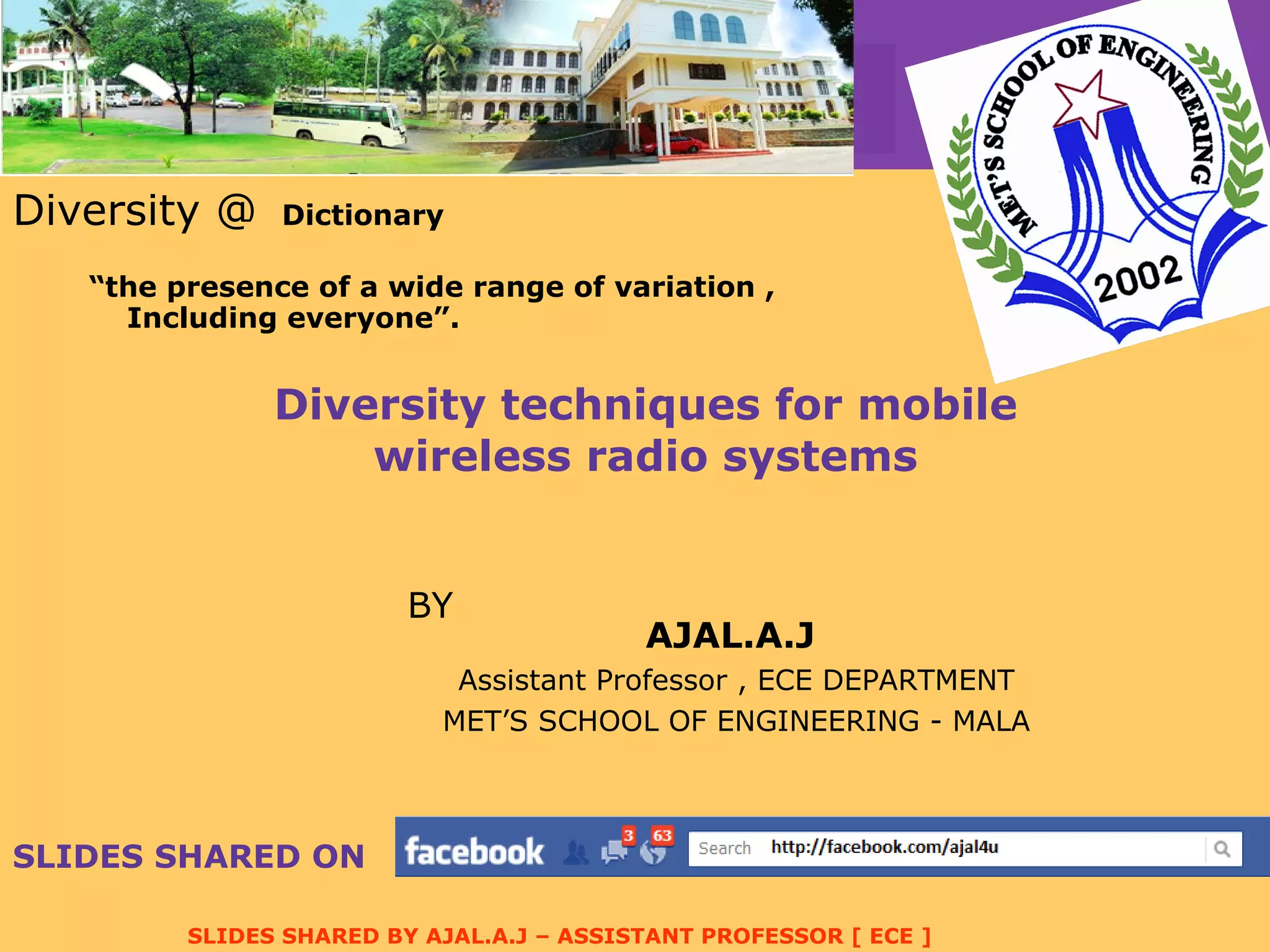 1) Diversity techniques in mobile wireless systems take advantage of multiple propagation paths to improve reliability by creating independent fading channels and combining the signals.
