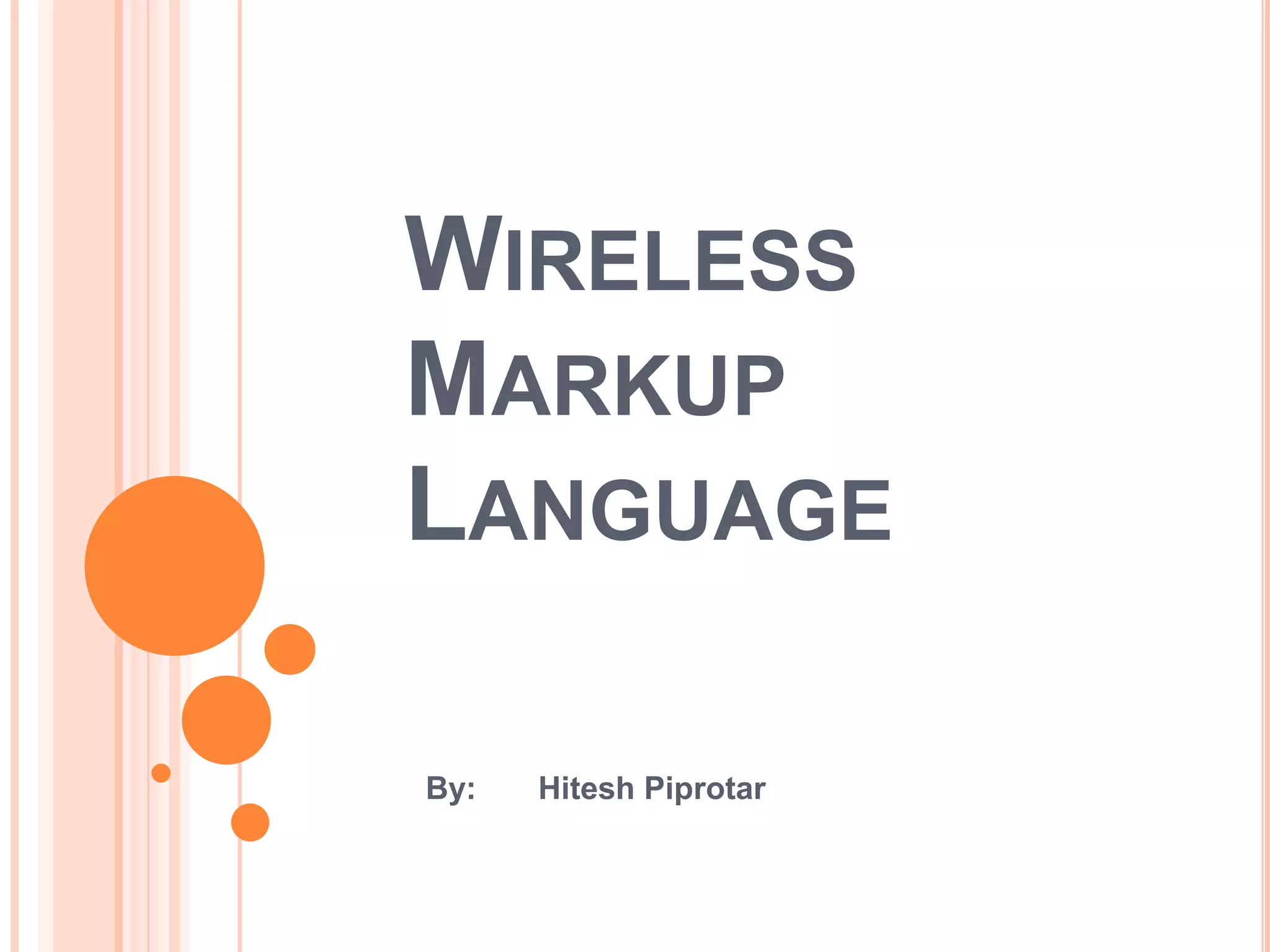 Wireless Markup Language (WML) is an XML-based language used to make content for mobile devices. It provides navigation, forms, text, images and hyperlinks similar to HTML but uses less bandwidth and processing power. A WML site consists of decks which contain cards that display content on the device screen one at a time. WML is simpler than HTML to optimize for limited mobile capabilities but has limitations in display variations across devices.