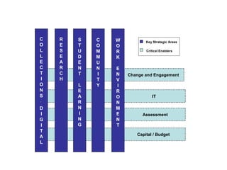 The document discusses the strategic planning process of the University of British Columbia Library, specifically focusing on life sciences libraries, and emphasizes the need for libraries to adapt to changing environments to avoid irrelevancy. It outlines internal and external factors impacting the library, such as community engagement, technological changes, and the importance of research collaboration. The strategic plan aims to enhance student learning, promote knowledge dissemination, and develop an effective IT infrastructure while fostering a culture of assessment and innovation.