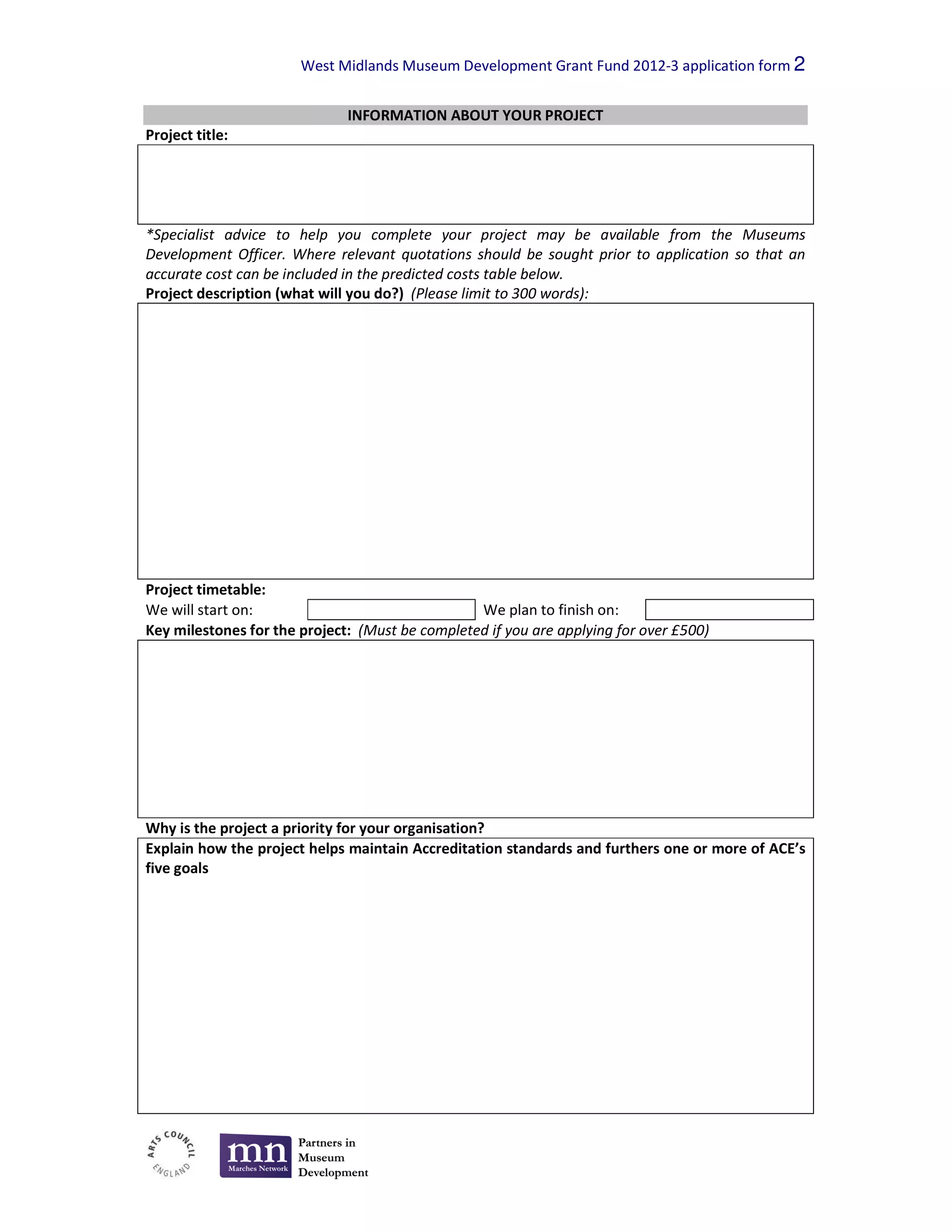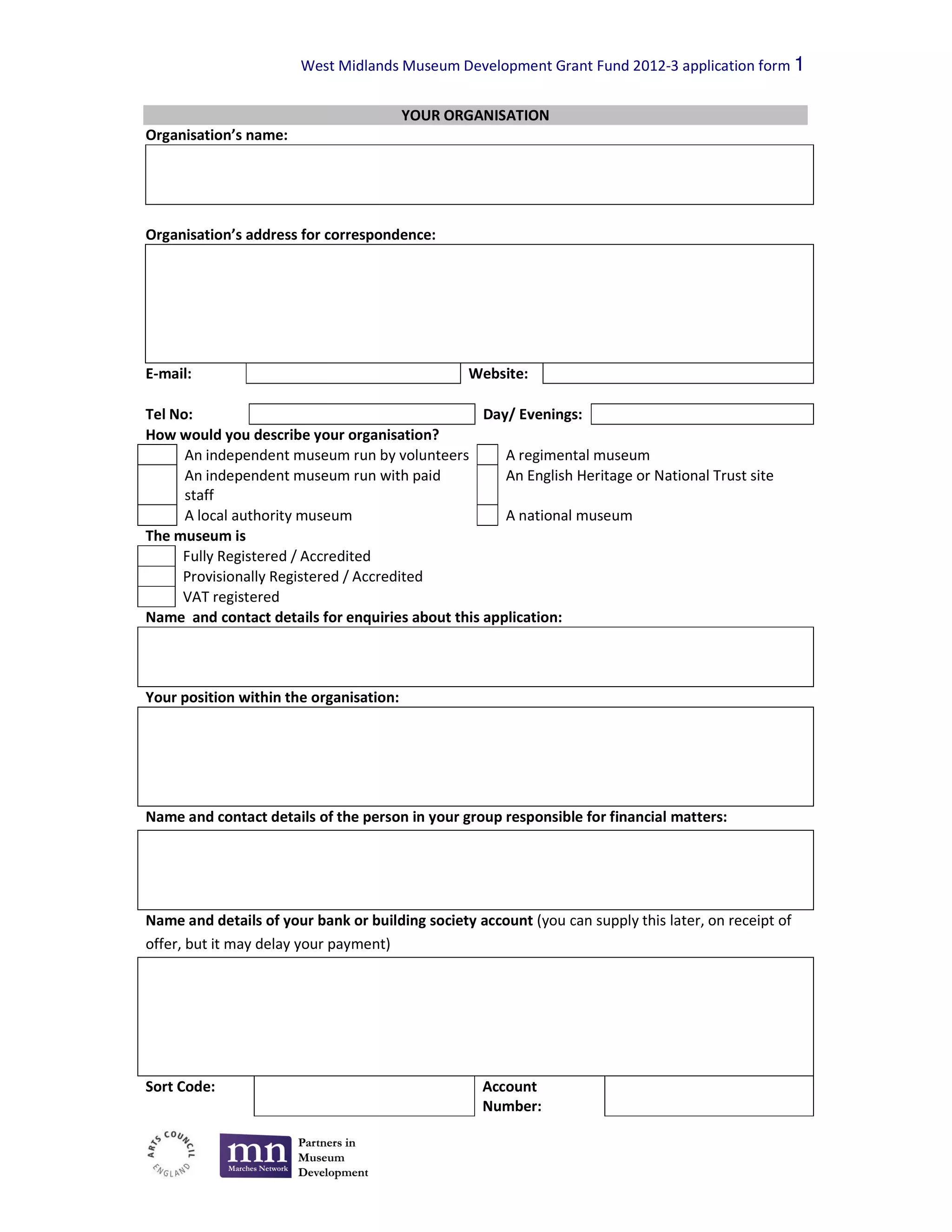 This document is an application form for the West Midlands Museum Development Grant Fund from 2012-2013. It requests information about the applicant organization, contact details, financial information, project details including goals, timeline and budget, and declarations. The form has 4 sections requesting organizational details, project description and goals, measuring outcomes, and costing and funding sources. It requires information to assess eligibility for funding under £500 or over £500.