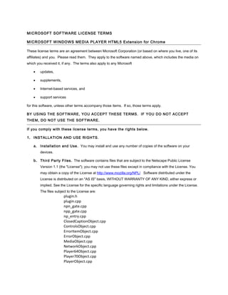 This document outlines the license terms for using the Microsoft Windows Media Player HTML5 Extension for Chrome software. It discusses installation and use rights, including making one backup copy. It also covers limitations on modifying, distributing, or commercially using the software. The terms disclaim all warranties and limit liability to $5 for direct damages only.