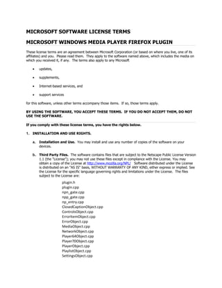 This document outlines the terms of a software license agreement for Microsoft Windows Media Player Firefox Plugin. It specifies that by using the software, the user agrees to the terms, which include allowing installation and usage on any number of devices. The software is licensed, not sold, and the user is only permitted to use it as expressly allowed in the agreement. The document also disclaims warranties and limits liability for damages to $5.