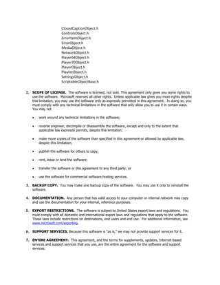 This document outlines the terms of a software license agreement for Microsoft Windows Media Player Firefox Plugin. It specifies that by using the software, the user agrees to the terms, which include allowing installation and usage on any number of devices. The software is licensed, not sold, and the user is only permitted to use it as expressly allowed in the agreement. The document also disclaims warranties and limits liability for damages to $5.