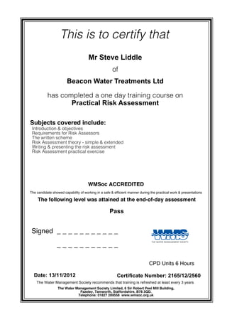 Mr. Steve Liddle of Beacon Water Treatments Ltd completed a one-day training course on Practical Risk Assessment on November 13, 2012. He passed the end-of-day assessment and received 6 CPD units. The course covered risk assessment theory, writing risk assessments, and conducting a practical risk assessment exercise.