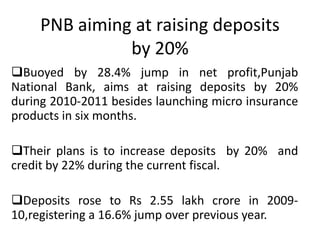 Punjab National Bank aims to raise deposits by 20% and credit by 22% during the current fiscal year based on a 28.4% increase in net profit. Reliance Industries may nominate Nita Ambani, wife of Mukesh Ambani, to the board of East India Hotels after acquiring a 14.12% stake in the company. Pension products offered by insurers and mutual funds could receive tax concessions under the new Direct Tax Code if they meet government standards regarding withdrawal limits and encouraging long-term retirement savings. Panasonic India plans to invest Rs. 1400 crore over the next three years to establish itself as a leader in home appliances in India.