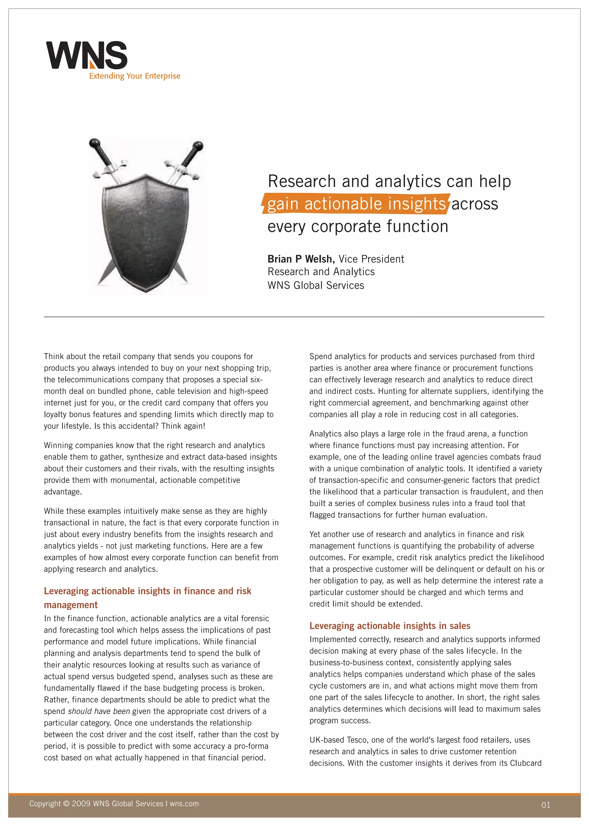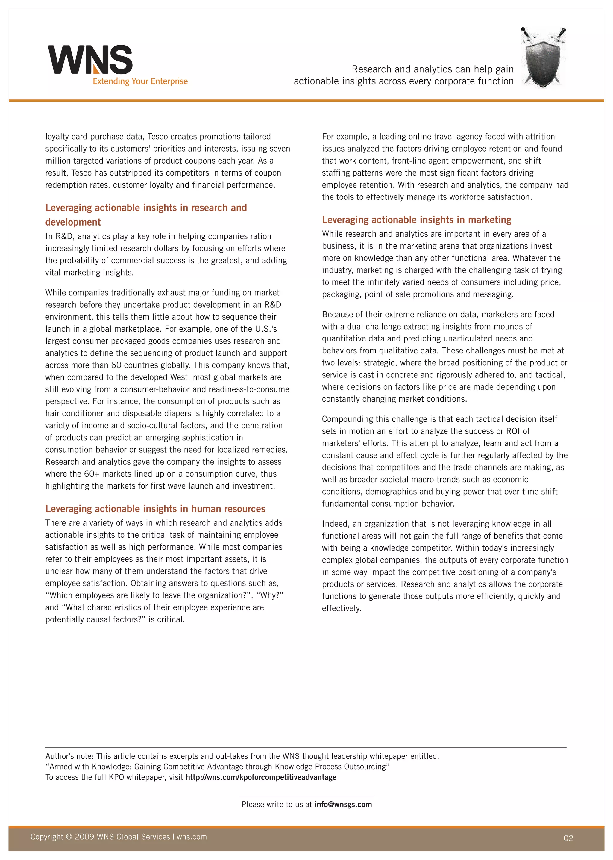 The document discusses how research and analytics can provide actionable insights across various corporate functions, including finance, marketing, sales, and human resources. It highlights the importance of leveraging data-driven insights to improve decision-making, customer retention, and employee satisfaction. Organizations that utilize research and analytics effectively gain a competitive advantage by optimizing their operations and understanding customer behaviors.