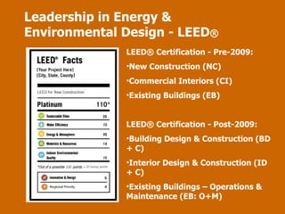 The document presents information on LEED® certified projects in Western New York, including various certification types and statistics. It highlights 16 certified buildings, their features, performance improvements, and the benefits of green building practices. Additionally, it mentions ongoing and future LEED® registered projects in the region.