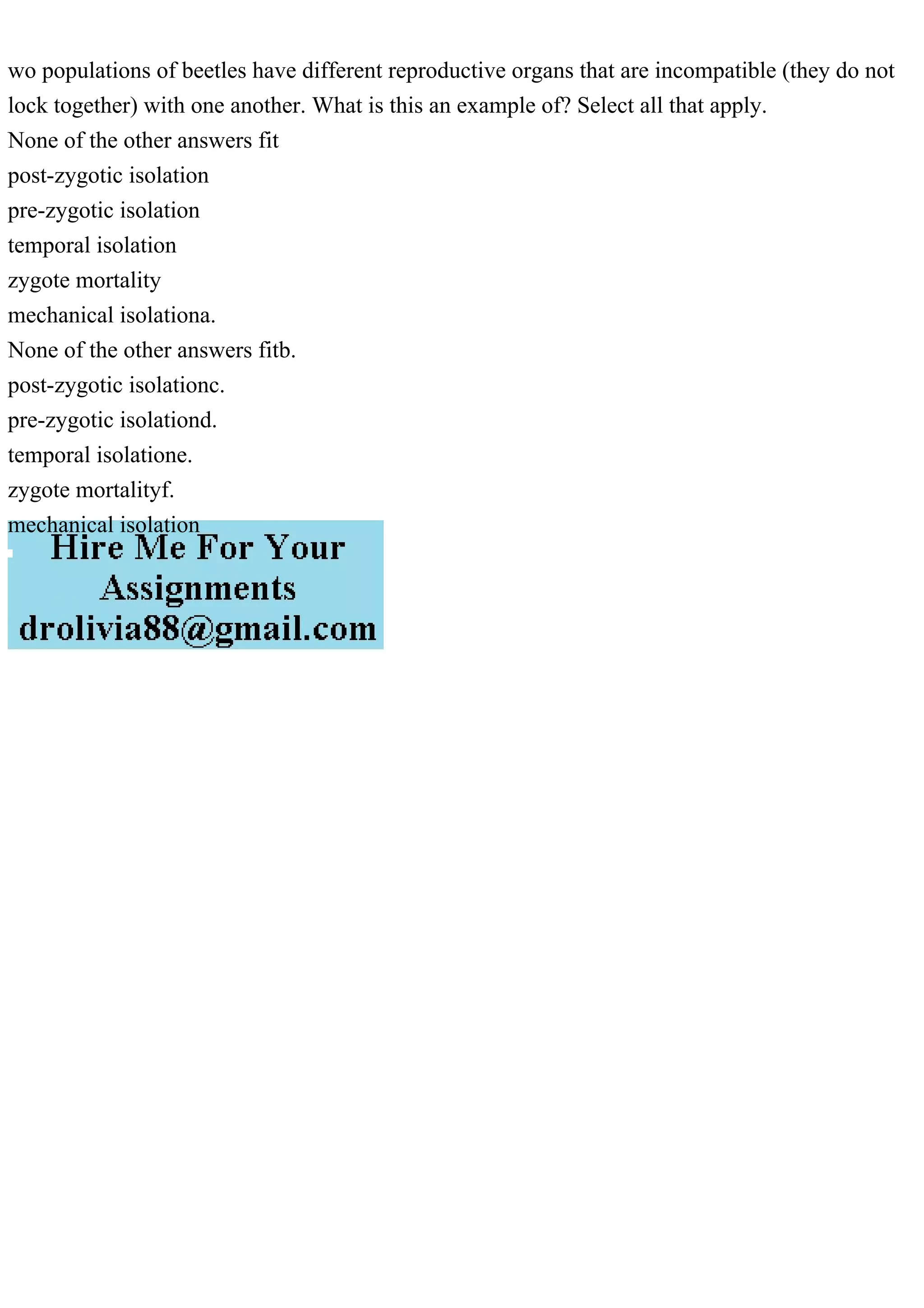 The document describes a scenario where two populations of beetles have incompatible reproductive organs, highlighting an example of mechanical isolation. This incompatibility prevents mating and fertilization, illustrating the concept of pre-zygotic isolation. The options provided include post-zygotic isolation, zygote mortality, and temporal isolation, but the correct answer relates specifically to mechanical and pre-zygotic isolation.