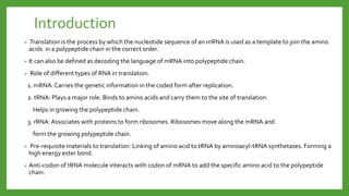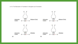 The document discusses codon-anticodon interactions and the wobble hypothesis. It explains that tRNAs have anticodons that interact with mRNA codons to add the correct amino acid to the growing polypeptide chain. The wobble hypothesis proposes that the third position of codons and first position of anticodons allow some variability, or "wobbling", in base pairing through interactions with inosine and other modified bases. This wobbling allows a single tRNA to bind to multiple codons, resolving the redundancy in the genetic code and allowing fewer tRNAs than codons.