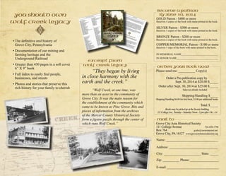 This document provides information about a book titled "Wolf Creek Legacy" published by the Grove City Area Historical Society. It summarizes that the book contains oral histories from local residents in their 80s and 90s in the early 1980s, carefully recorded by Lillian Reynolds Reeher, that document stories about life on the banks of Wolf Creek and the history of the Grove City area. It encourages supporting the historical society by becoming a patron or ordering copies of the book, which combines these oral histories into a definitive history of the local area.