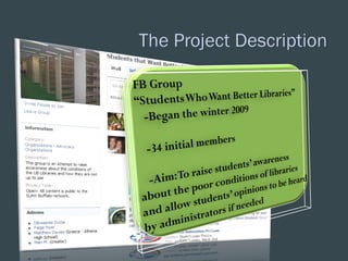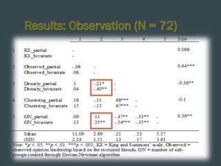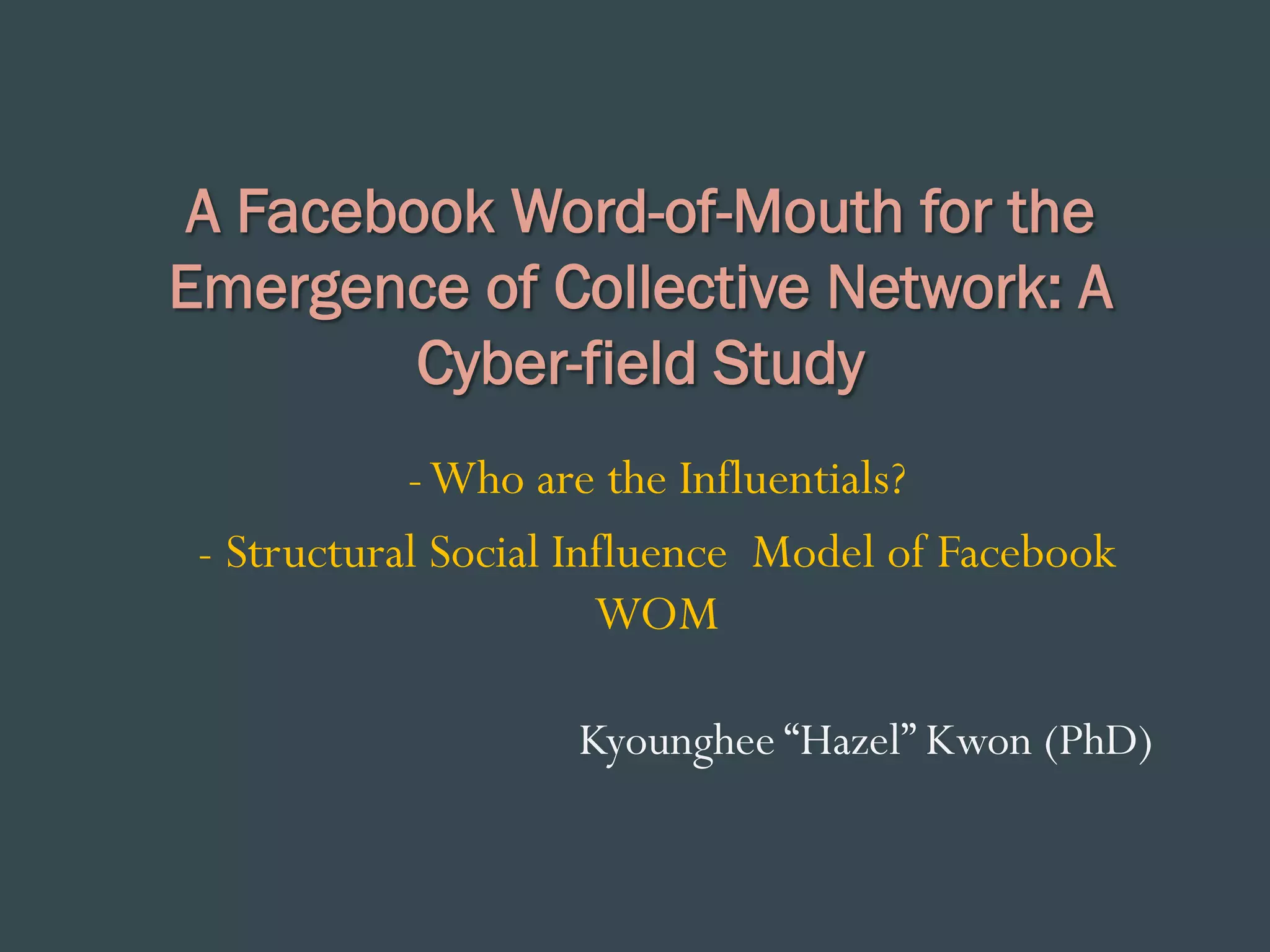 This document summarizes a study on word-of-mouth (WOM) and social influence on Facebook. The study examined WOM at both the individual and network levels. At the individual level, it looked at identifying influential users and their characteristics. It found that an observation method of influence was more valid than self-designation. At the network level, it developed a structural social influence model of Facebook WOM incorporating direct contact, interpersonal contagion, and network embeddedness. The model was tested on a network of nearly 4,000 users to understand how social network factors influence WOM.