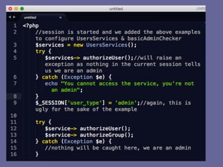 Aspect oriented programming (AOP) allows developers to separate cross-cutting concerns from the main application code. This helps keep code organized and focused on single responsibilities. AOP works by defining points in the program execution, called join points, where additional behavior can be inserted. This additional behavior is defined through advice that runs before, after, or around join points. Pointcuts are used to identify which join points specific advice should apply to. Aspects group advice and pointcuts to encapsulate a concern.