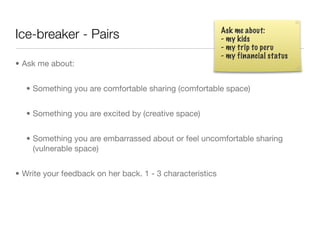 The document outlines an agenda for a workshop focusing on personal storytelling and self-reflection, including activities such as icebreakers, discussions, and journaling. It emphasizes the importance of understanding oneself, making choices, and the transformative power of personal experiences. Additionally, it includes inspirational quotes and takes a holistic approach to health and personal growth.