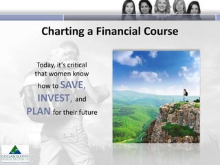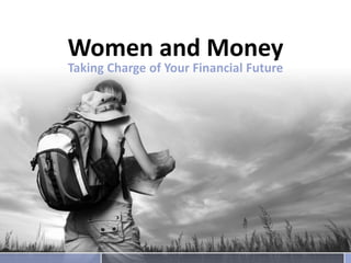 This document discusses financial challenges women often face and provides advice on how to take charge of one's financial future. It notes that while women have made progress in the workforce and education, they still face challenges such as lower lifetime earnings, longer lifespans, and greater risks of single parenthood and caregiving responsibilities. The document recommends that women save as much as possible starting early, become knowledgeable investors, advocate for themselves in the workplace, plan for retirement including Social Security, protect their income and assets with insurance, and create an estate plan. Taking control of finances, getting educated, and working with advisors can help women overcome challenges and achieve financial security.