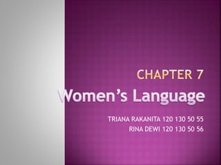 The document discusses gender differences in communication styles. It notes that men interrupt others more than women and women get interrupted more than men. It also notes that women provide more positive feedback and encouragement during conversations than men. Specific examples are given of conversations where the man interrupts the woman multiple times but she continues the discussion, and of a conversation where the woman provides short responses like "Mm" and "Right" to encourage the other woman to continue speaking.