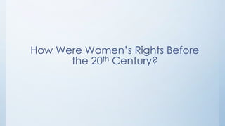 The document discusses the history of women's rights from the 19th century to today. It notes that before the 20th century, women did not have equal rights to men. The first women's rights convention was held in 1848 in Seneca Falls, NY. In 1869, Susan B. Anthony and Elizabeth Cady Stanton formed the National Woman Suffrage Association to fight for women's right to vote. The 19th amendment in 1920 helped bring more equality by giving women the right to vote. While progress has been made, the document notes women still face issues like the glass ceiling and lack of full equality in some parts of the world.