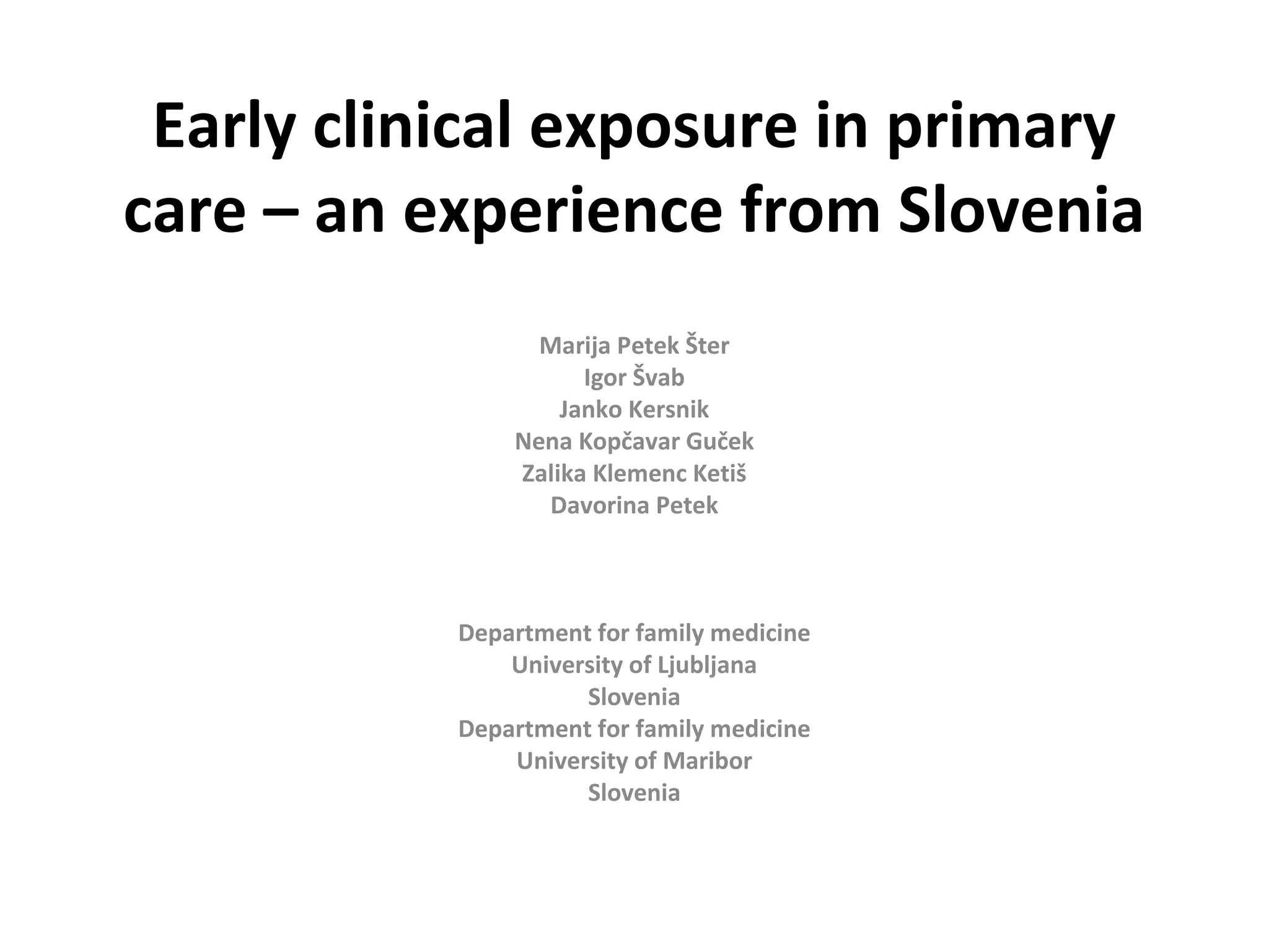 This document describes an early clinical exposure (ECE) curriculum implemented at medical schools in Slovenia. [1] The curriculum introduces first-year medical students to patients through a "Communication" course. [2] Students learn communication skills through lectures, role-playing exercises, interviewing nursing home residents, and observing general practitioners. [3] Feedback from students and teachers was positive, finding the ECE educationally effective and helping students develop confidence and identity as future physicians. However, some challenges around student preparedness and assessment subjectivity were noted.