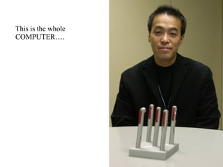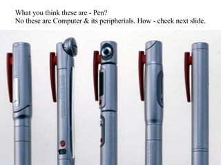 This document discusses the parts of a computer and its peripherals, showing how they connect and are used. It presents an image of a computer, keyboard, and screen and asks the reader to arrange them properly and then use their fingers on the keyboard image to type. It encourages exploring other models as well.